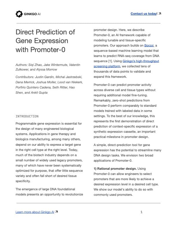 The emergence of large DNA foundational models presents an opportunity to revolutionize promoter design. Here, we describe Promoter-0, an AI model capable of generating tunable and tissue-specific promoters. Our approach builds on Borzoi, a sequence-based machine learning model that learns to predict RNA-seq coverage from DNA sequence [1]. Using Ginkgo’s high-throughput screening platform, we collected tens of thousands of data points to validate and expand this framework.